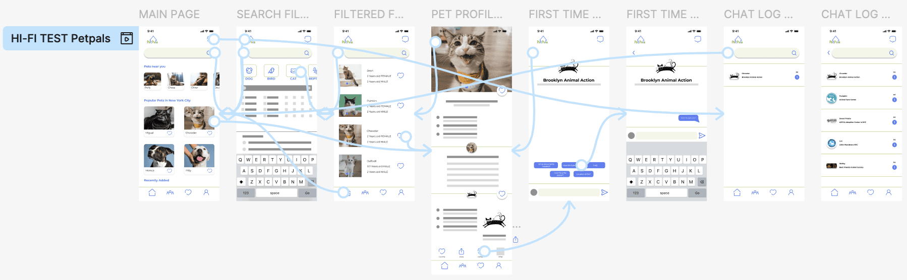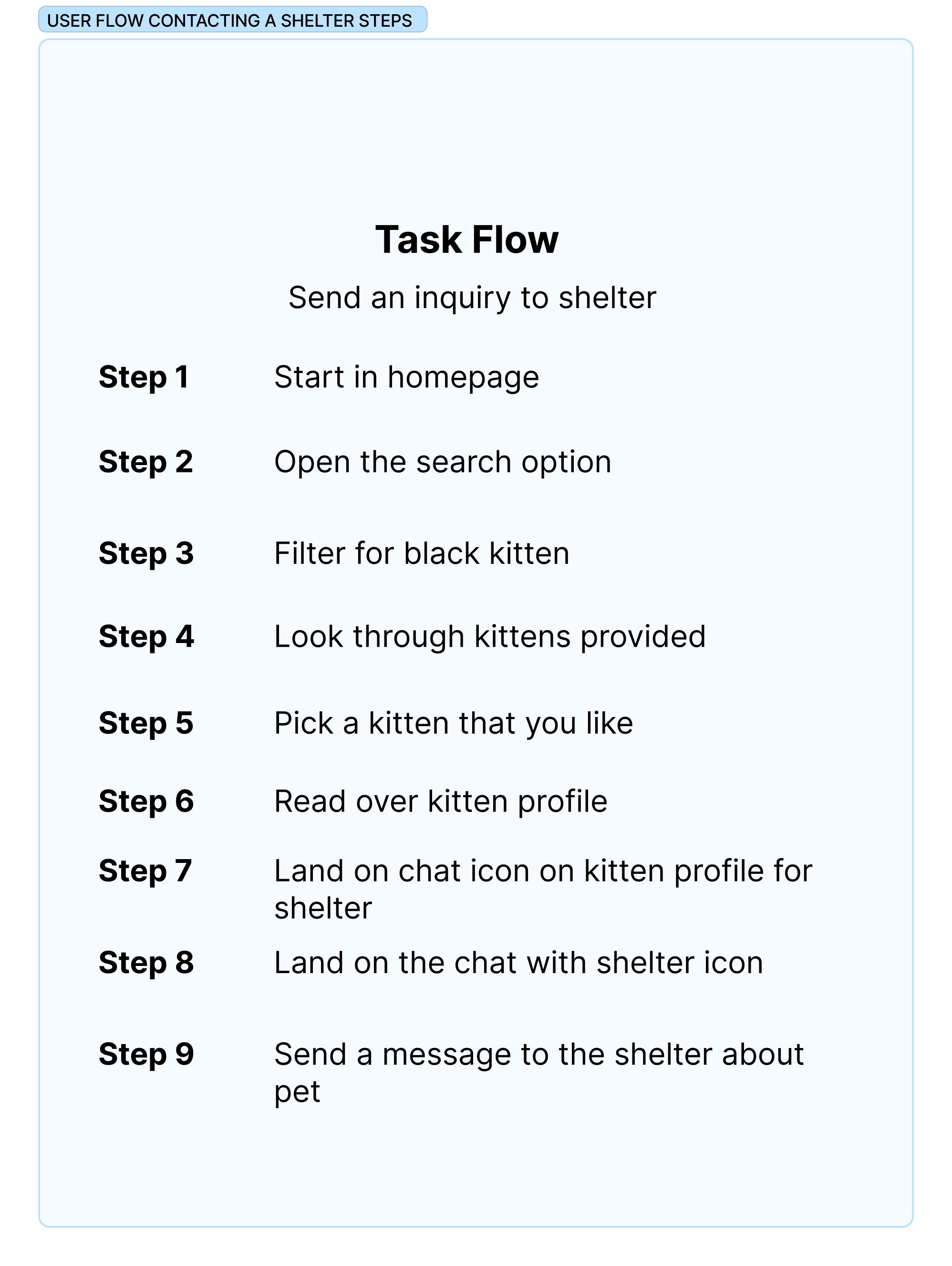 I designed a task flow that guides users through the process of selecting a specific pet, in this case, a cat, and directly contacting the shelter for more information. This flow ensures that users can easily inquire about their chosen pet and simplifies communication with the shelter, making the adoption process more efficient and user-friendly.