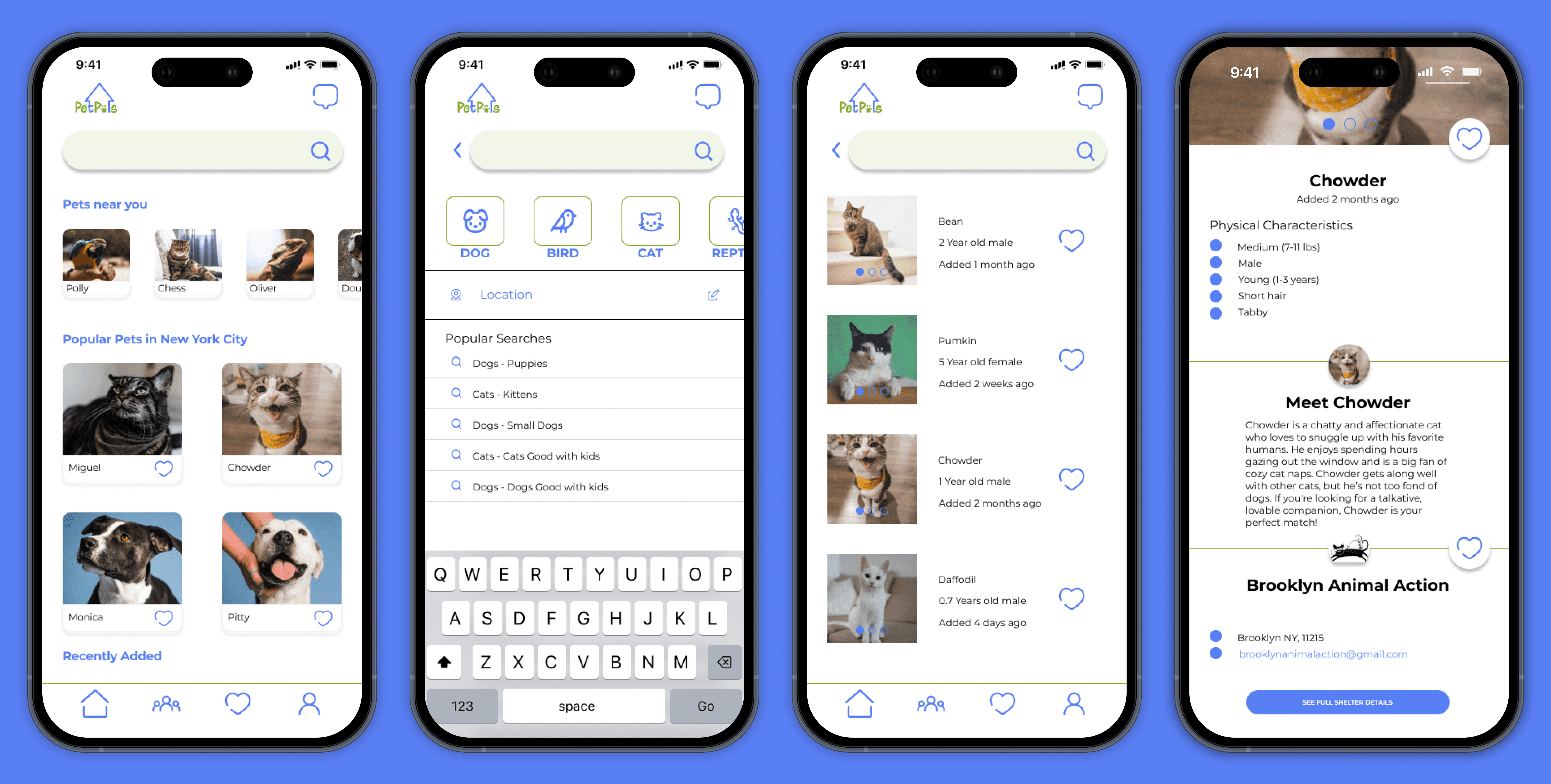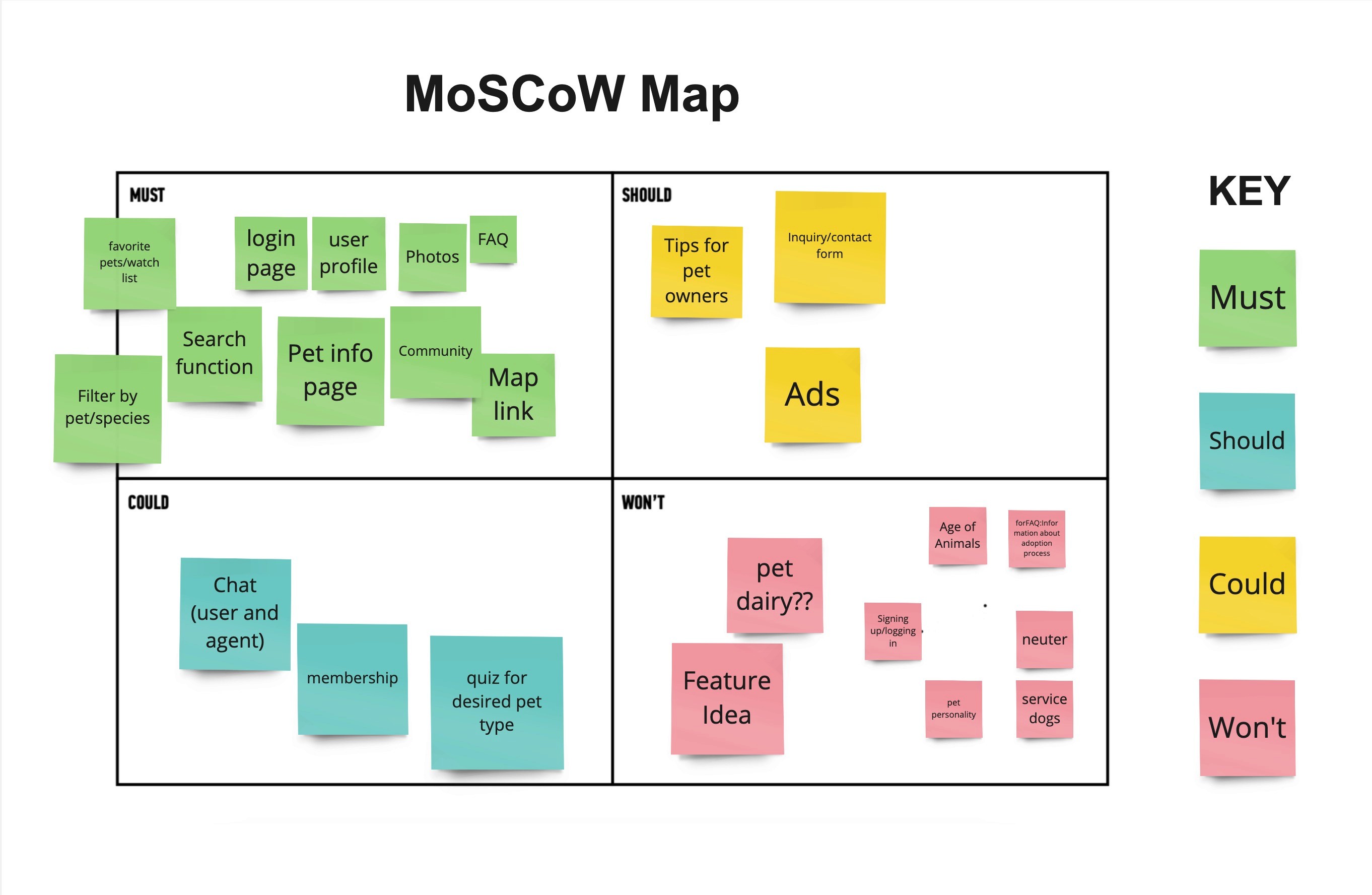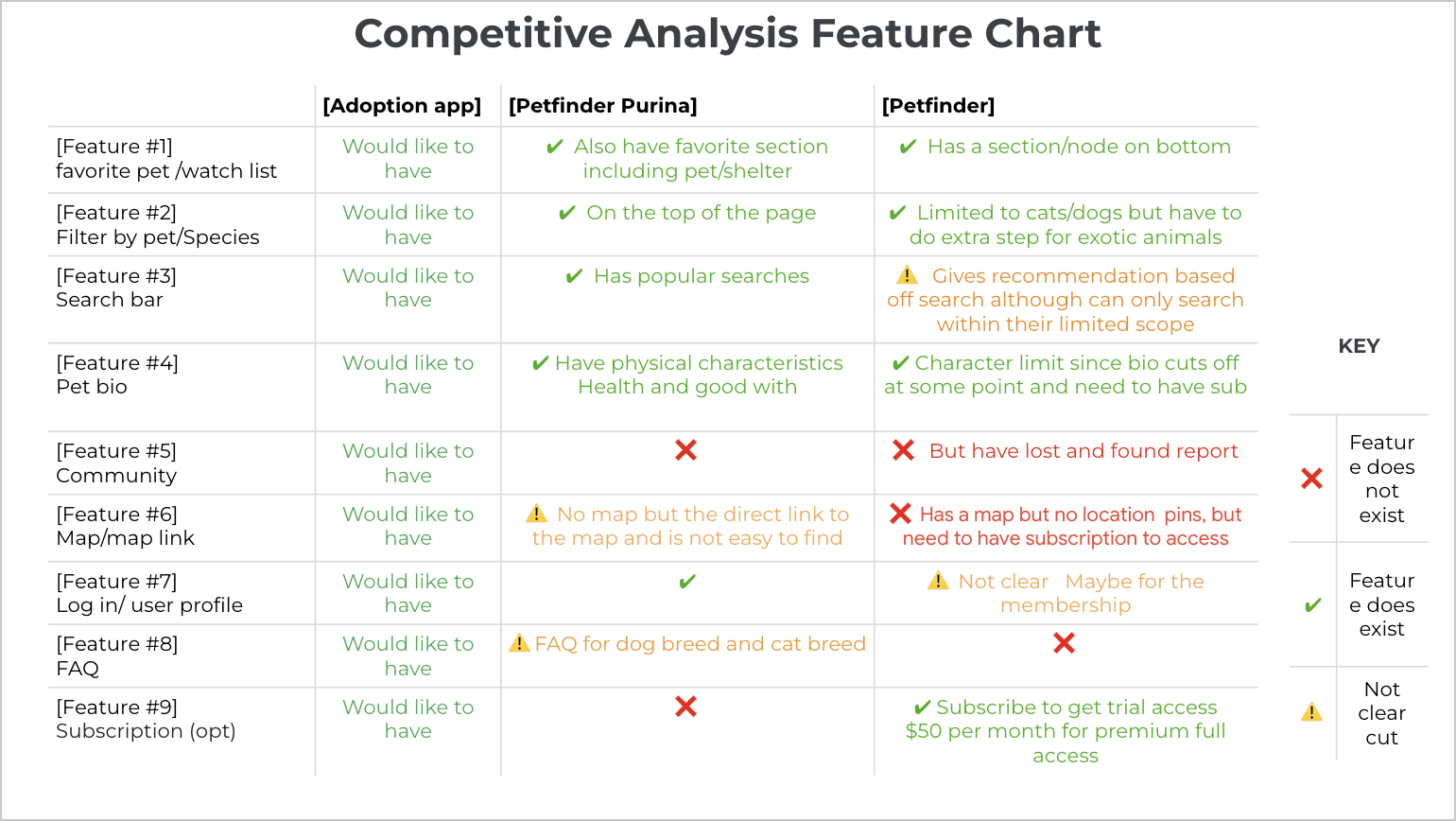 We conducted a competitive analysis of several pet adoption apps to identify their key features and assess what worked well and what didn’t. This analysis helped us determine which features we wanted to incorporate into our own