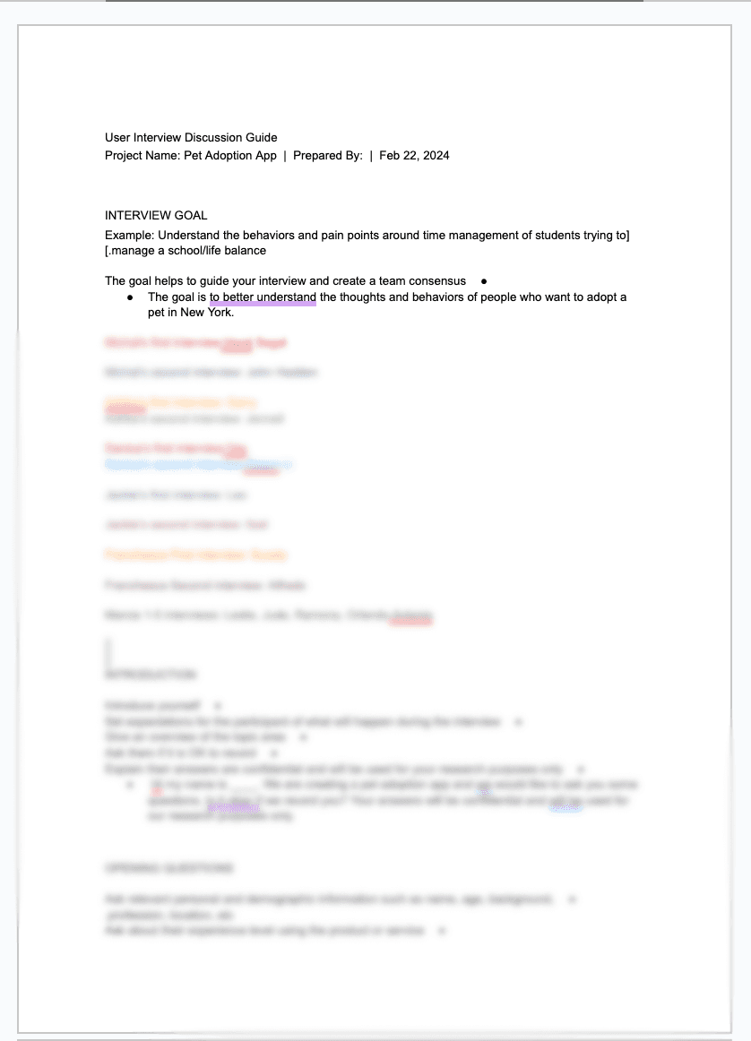My team and I created an interview discussion guide, starting with a clear problem statement to focus our research. We brainstormed user-centered questions, keeping UX research practices in mind to avoid any biases or framing issues, and divided sections among team members. This guide provided us with valuable insights into the behaviors of people who have adopted pets, as well as those who haven't due to issues in the adoption process, helping us better understand user pain points and needs.