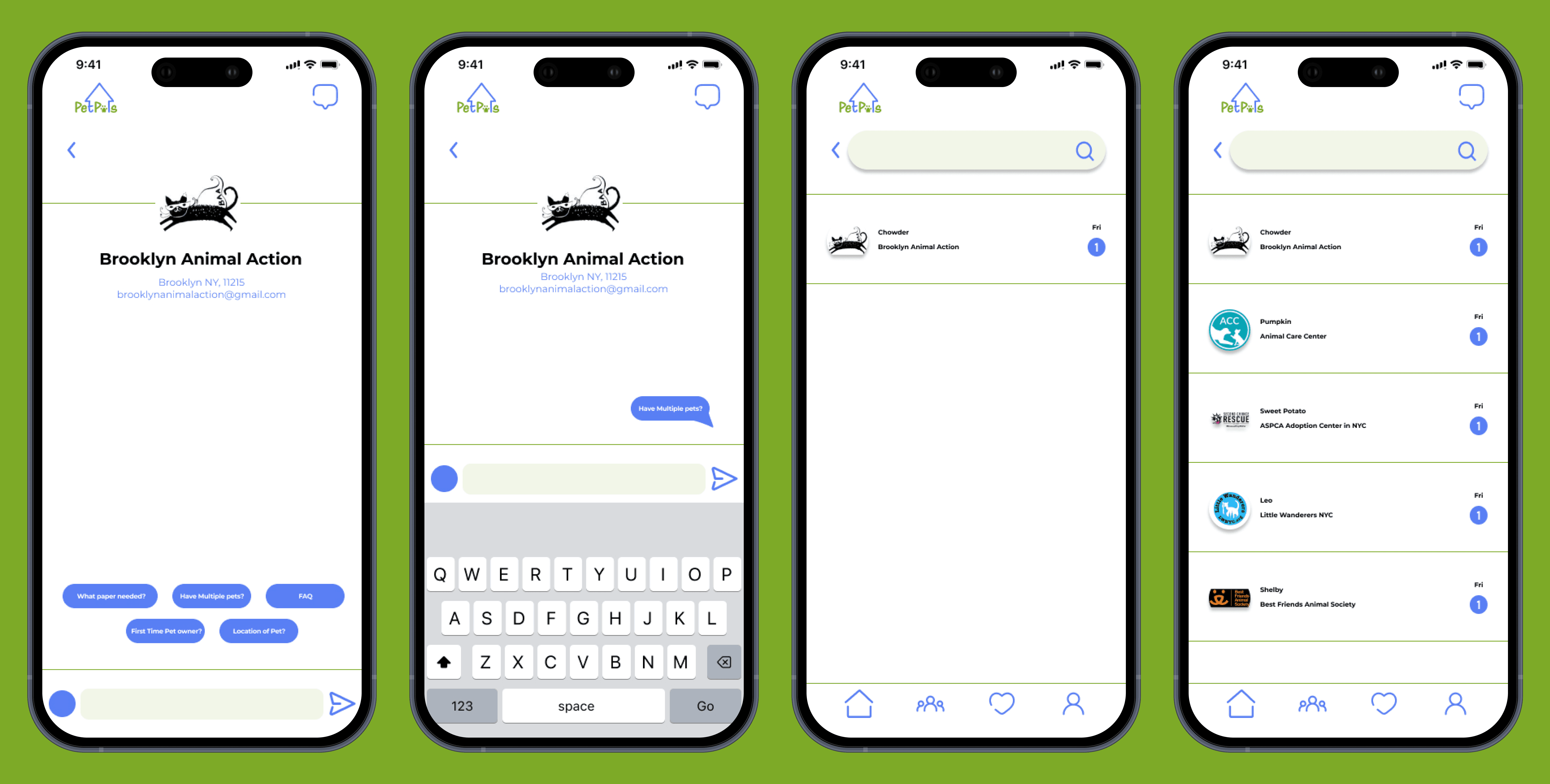 Finally, incorporating the brand identity, visual design, and research insights, I implemented these elements into my finalized screens. These screens focus on the user inquiring directly to the shelter about a specific pet, ensuring a cohesive design that aligns with our brand's values while enhancing the overall user experience.