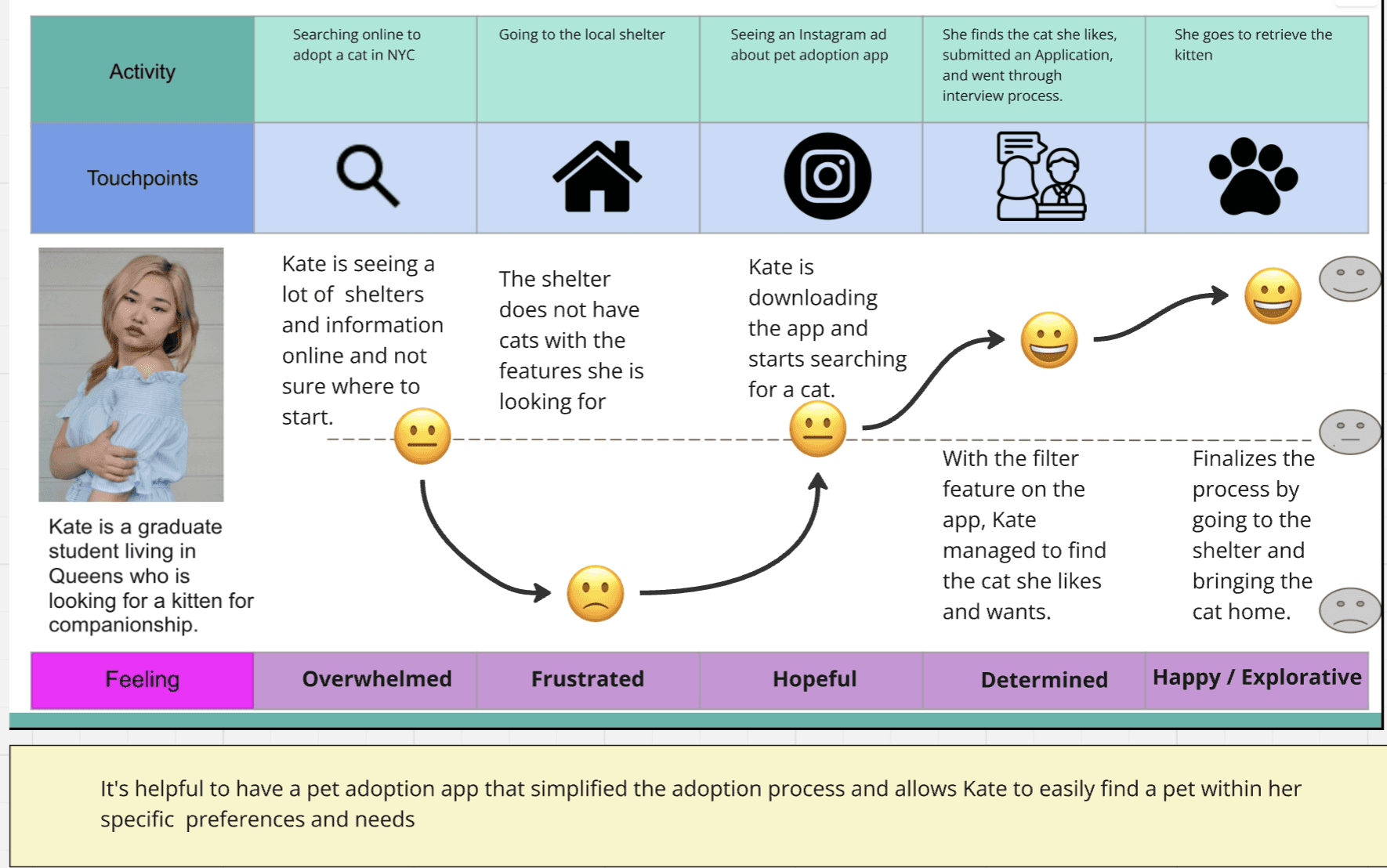 We then developed a Customer Journey Map that outlined the steps a user would take, from discovering our app to using it, including their actions and emotions at each stage of the adoption process.